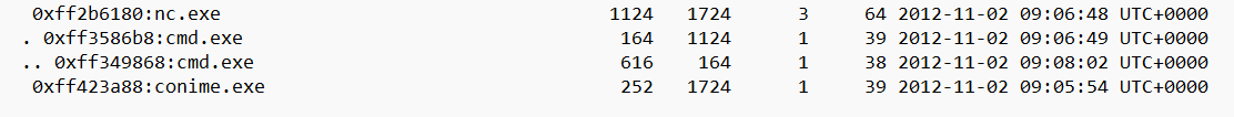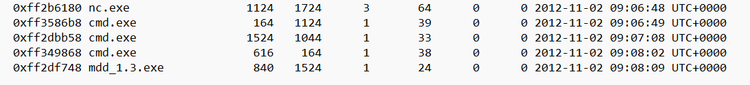 psxview의 결과를 보았을 때, nc.exe가 메모리에 로드된 후 이전의 프로세스들의 연결이 끊긴 것을 확인. 즉, 악성실행파일은 nc.exe이다.