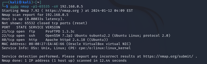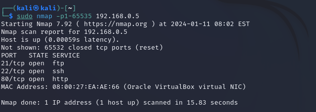 ( -p : port번호 / 1번~65535번 포트까지 살아있는 지 죽어있는 지 확인 )