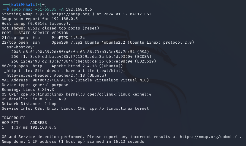 -A : 운영체제, 버젼 탐지, 스크립트 스캐닝(NSE) 및 traceroute 사용