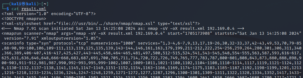 sudo nmap -sV 192.168.0.4 -oX result.xml