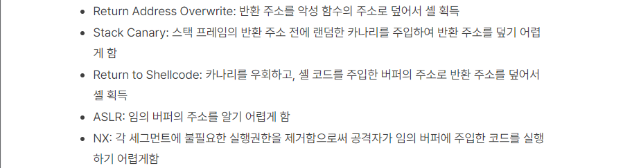 : nx로 인해 공격자가 버퍼에 입력한 셸 코드를 실행시키기는 어려워졌으나, stack buffer overflow로 반환 주소를 덮는 것은 여전히 가능 => 실행권한이 남아있는 코드 영역을 반환 주소로 덮는 공격 기법을 고안