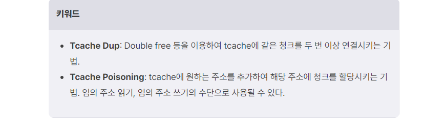=> 임의의 청크 1개에 대해 free를 두번이상 적용 => 청크를 free list (tcache / bins 등) 에 여러번 추가할 수 있음을 의미