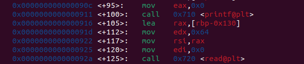 read는 <main+125> 을 통해 [rbp-0x130]에 위치한다는 것을 알 수 있고,