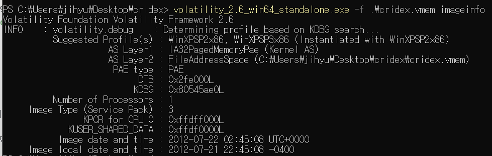 $ volatilty(tab) -f <이미지 파일> imageinfo : 이미지에 대한 정보(어떤 운영체제의 메모리인지 알려줌)