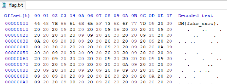 파일을 다운로드받아보면 snow.jpeg파일과 flag.txt가 있다. txt파일을 hxd에 넣어보니