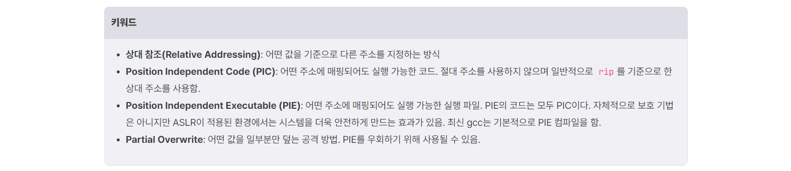 Memory Corruption : Format String Bug format string을 인자로 사용하는 함수 : scanf, fprintf, fscanf ... 등 => 포맷 스트링을 채울 값들을 레지스터나 스택에서 가져옴 그러나, 필요로 하는 인자의 개수 & 함수로 전달된 인자의 개수를 비교하는 검증이 존재x => 악의적으로 다수의 인자요청 - 레지스터나 스택을 읽거나 쓸 수 o :: FSB (format string bug) 포맷 스트링 - specifier 형식 지정자 : d 10진수정수 / s 문자열 / x 부호없는 16진수 / n 현재까지 사용된 문자열의 길이를 저장 / p void형 포인터 -width 최소 너비 지정 : 최소 너비 지정 -> 더 짧으면 공백문자를 패딩 : 예 ) %.5..